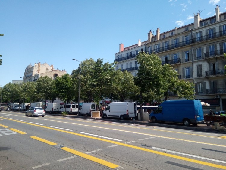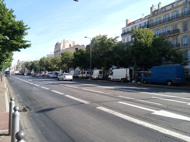 La piste cyclable temporaire du Prado très utilisée par tout type de véhicules (et du coup, par sécurité, inusitée par les cyclistes : c’est une question de bon sens évident)