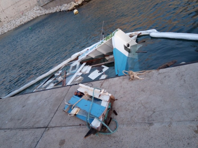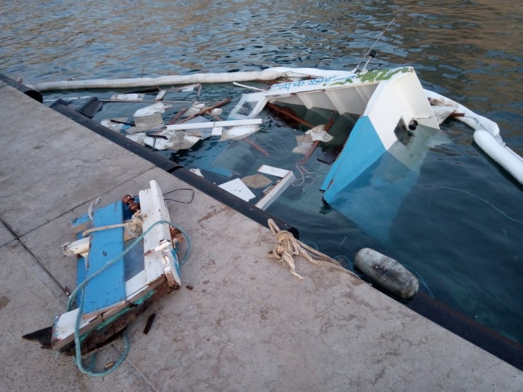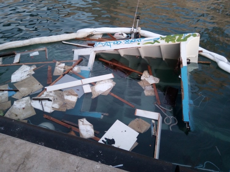 Selon les dires du chef de bord (qui est également le propriétaire), c’est le dimanche 7 juin aux alentours de 16h qu’après un léger choc (parmi tant d’autres, ces derniers jours ayant été marqués par de fortes vagues) contre le quai d’amarrage, il prit l’eau… Les occupants du navire (le chef de bord ainsi qu’un invité présent à bord) purent heureusement s’extraire non sans quelques difficultés. S’en suivirent des allers-retours (du chef de bord) afin de récupérer toutes les affaires qui pouvaient l’être.