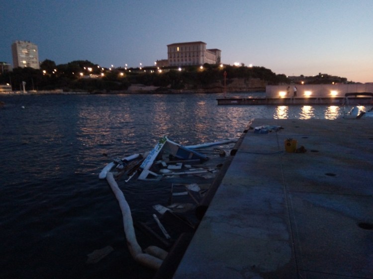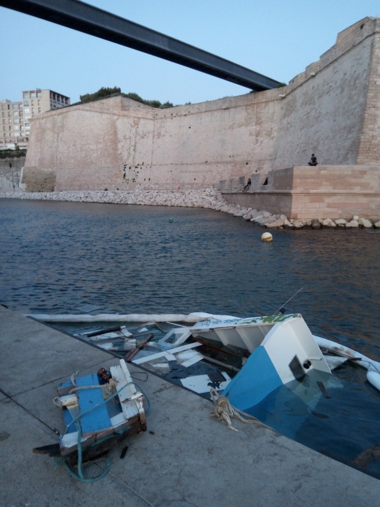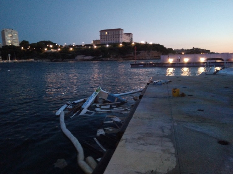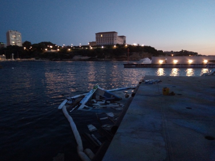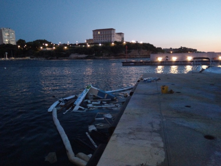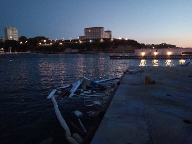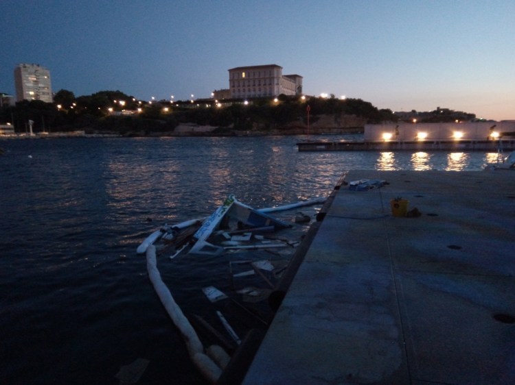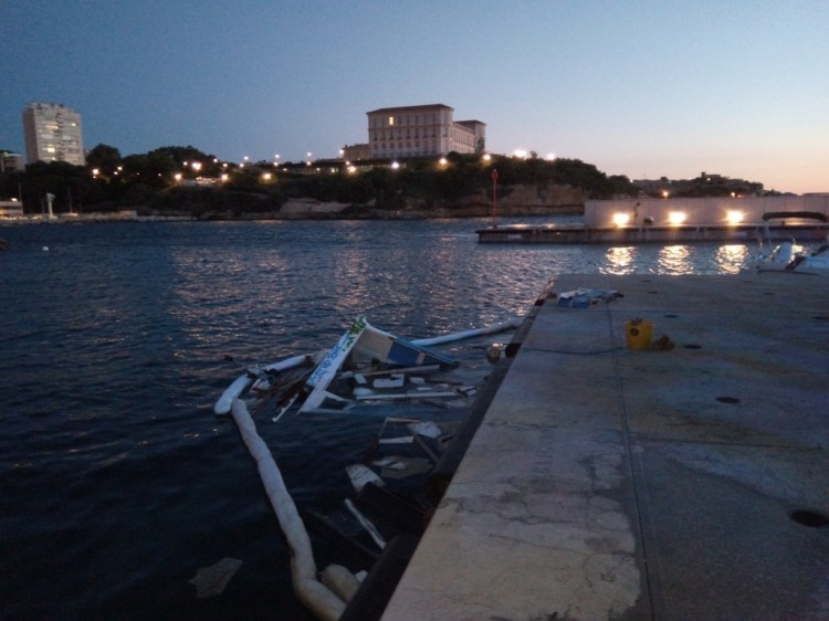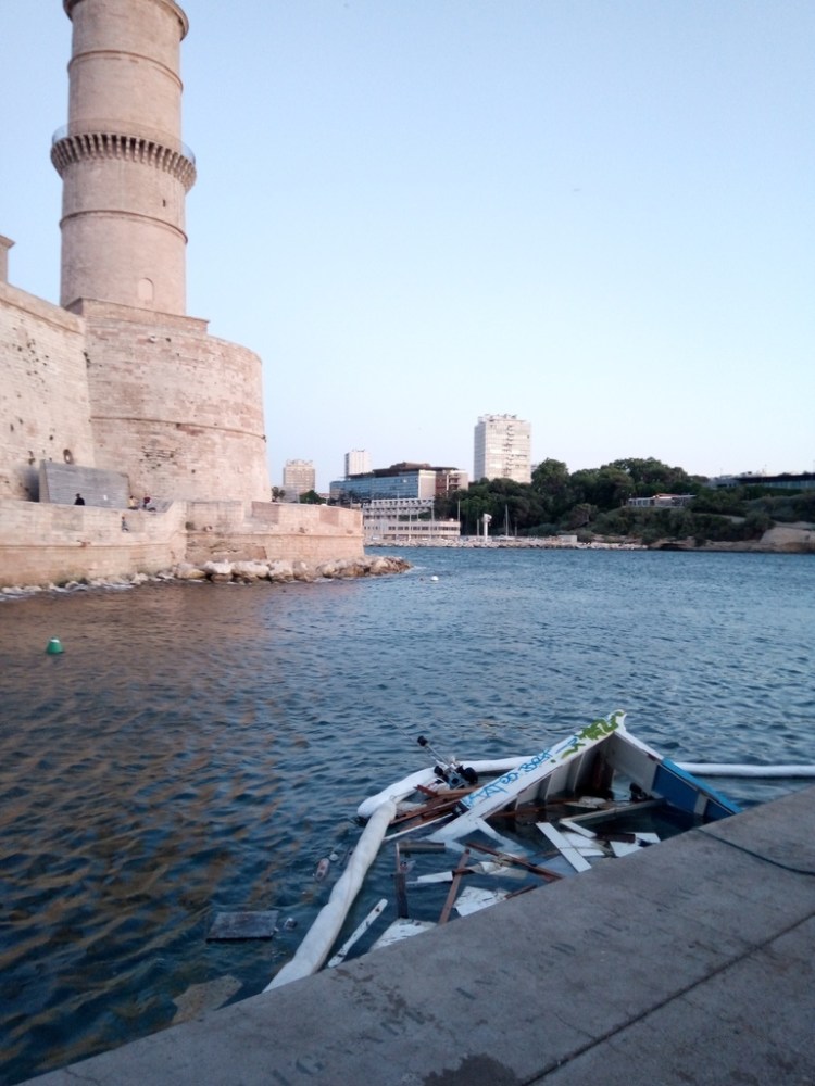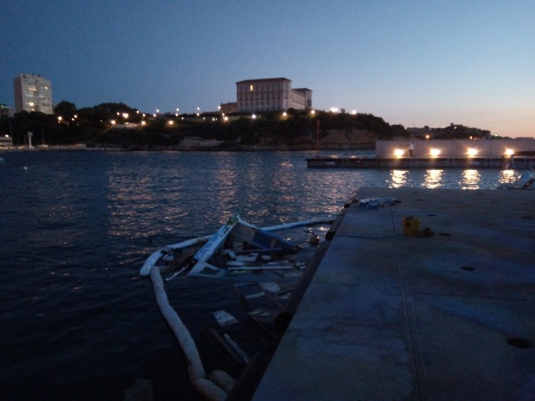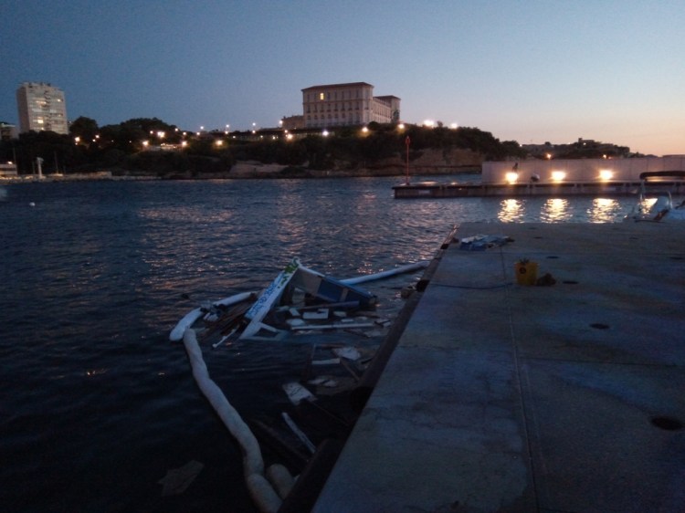 Cependant, même si cet optimisme était reconfortant et de bon alloi, c’était sans compter sur les vagues qui ont déferlé sur le port de Marseille en ce début de mois de juin. Acculé par la Capitainerie dans une position sur le quai particulièrement exposée (notez l’angle saillant formé par les fortifications sur l’autre rive…) , il fut baloté nonchallament par les flots…